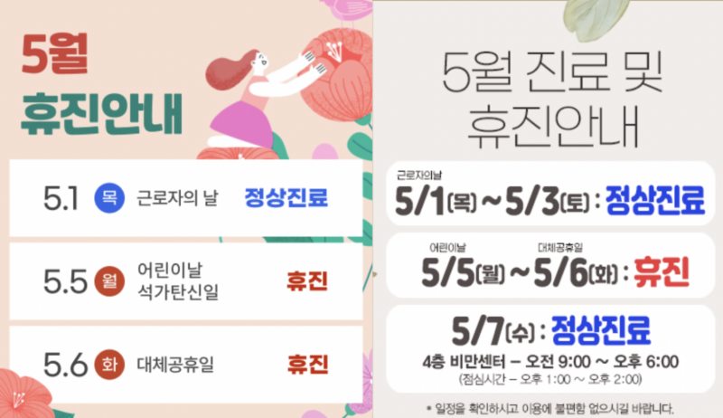 5월 1일이 법정휴일이지만, 5월 1일부터 3일까지는 정상 근무를 하고, 5월 5일과 6일을 연달아 쉬는 병원들이 많았다.
