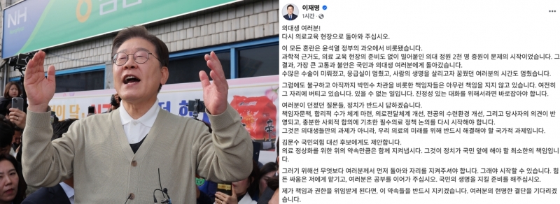 끝으로 이 후보는 의대생들을 향해 "힘든 싸움은 저에게 맡기고, 여러분은 공부를 이어가 주십시오. 국민의 생명을 지킬 준비를 해주십시오"라며 "제가 책임과 권한을 위임받게 된다면 이 약속을 반드시 지키겠다. 여러분의 현명한 결단을 기다리겠다"고 덧붙였다.