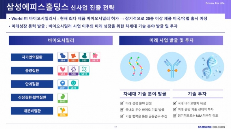 삼성바이오로직스는 순수 CDMO 기업으로서 ‘생산 능력 확대’, ‘제품 포트폴리오 다변화’, ‘글로벌 거점 확보’의 3대 축 성장 전략을 기반으로 항체·약물접합체(ADC), 아데노연관바이러스(AAV), 사전충전형 주사기(PFS) 등 고부가 신사업 투자도 가속화한다.
