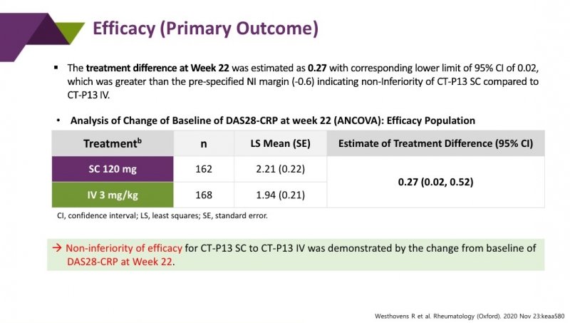 1차 평가변수인 22주차에서의 DAS28-CRP(질병활성도 평가지표-C반응성단백) 변화량 분석 결과, 두 군 간 차이는 사전에 설정된 비열등성 마진 내에 포함돼 통계적 비열등성을 입증했다. 그러나 약동학(PK) 데이터에서는 뚜렷한 차이가 관찰됐다.