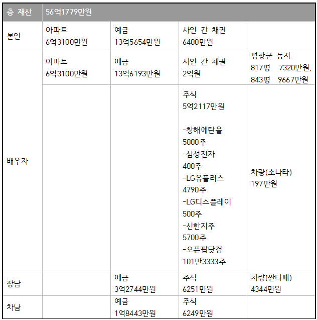 배우자는 예금 13억6193만원, 사인 간 채권 2억원, 평창군 봉평면 농지 817평(7320만원)과 843평(9667만원) 등을 신고했다.