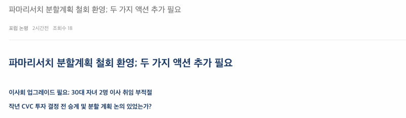 한국기업거버넌스포럼은 9일 "파마리서치의 인적분할 계획 취소를 환영하면서도 추가적으로 이사회 전면 개편이 필요하다"는 논평을 내놨다.