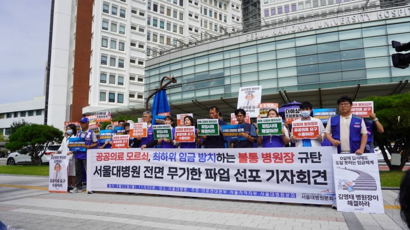 공공운수노조 의료연대본부 서울대병원 분회는 22일 서울대병원 본관 앞에서 기자회견을 열고 이 같은 계획을 밝혔다. 소속 조합원 수는 3600명이다.