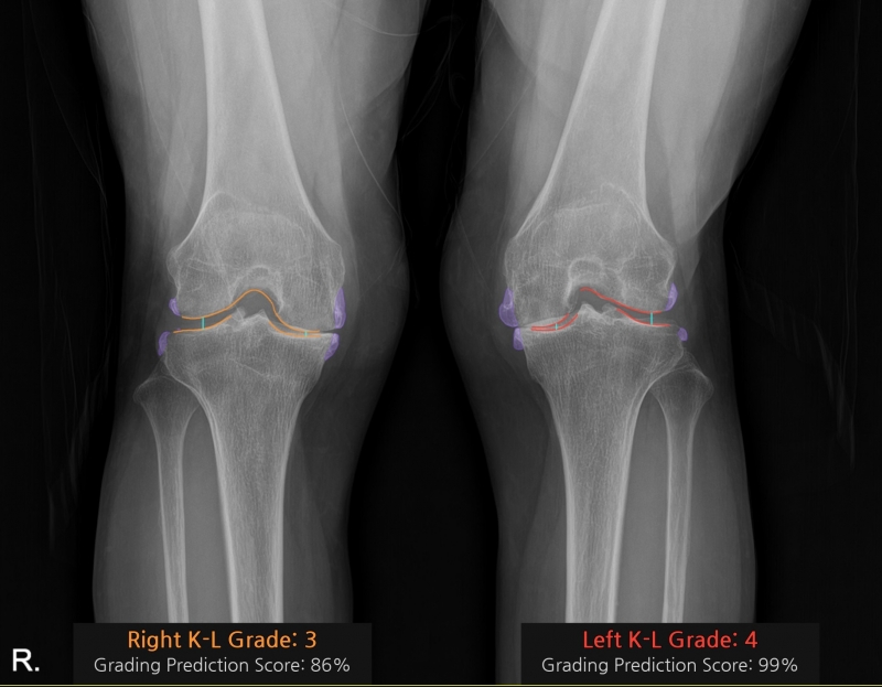 코네보 코아는 무릎 X-ray 영상을 분석해 관절염 심각도를 ‘K-L(Kellgren–Lawrence) 등급’으로 판정하고, 골극과 관절 간격을 시각화해 제공한다.