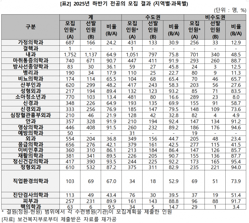 특히 비수도권은 핵의학과(3.4%), 흉부외과(4.9%), 소아청소년과(8.0%) 등에서 의료공백이 심화되고 있었다.