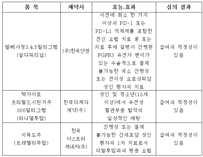 얀센의 '발베사정'과 다케다의 '탁자이로주', 아스트라제네카의 '이뮤도주'가 신규 급여 적정성을 인정받았으며, 아스트라제네카의 '임핀지주'는 담도암 1차 치료로 급여 범위 확대에 성공했다.