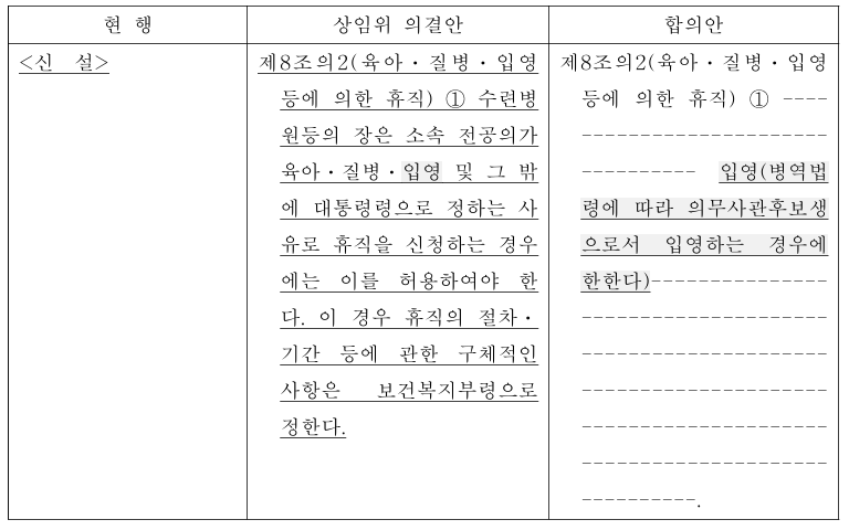 전공의들의 주요 요구였던 수련 연속성 보장 대목은 수정 의결됐다. 당초 출산 전후, 유산·사산 휴가, 육아, 질병, 입영 등으로 휴직 후 복귀한 경우 수련 연속성을 보장한다는 내용이었다.