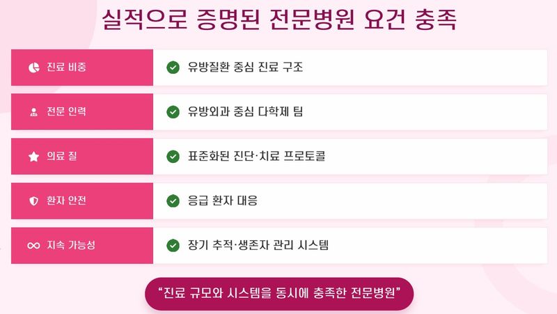 또한 유방암 환자가 고혈압, 당뇨 등 기저질환을 동반하거나 수술 후 합병증 관리가 필요할 때, 다른 진료과와의 즉각적인 협진이 가능하다는 것을 의미한다.
