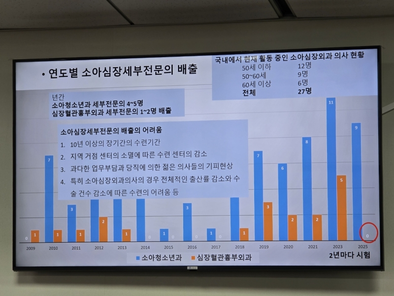 김 교수에 따르면 국내에서 연간 배출되는 소아심장 분야 세부전문의는 소아청소년과 세부전문의는 4~5명 수준, 심장혈관흉부외과 세부전문의는 1~2명 수준이다.