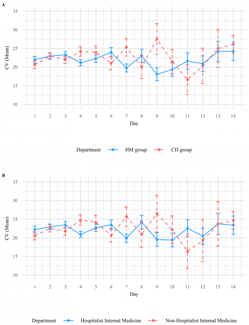 그럼에도 불구하고 혈당 조절 양상을 비교한 결과, 입원전담전문의 진료군에서 재원 기간 혈당 변동성이 지속적으로 감소하는 경향이 관찰됐으며 임상과 진료군 대비 통계적으로 유의한 차이를 보였다(p=0.002).