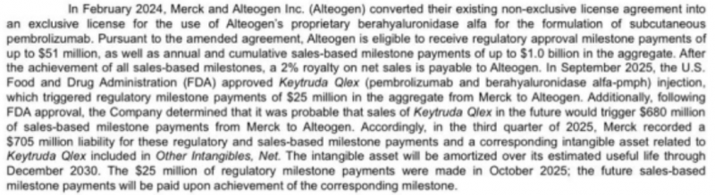 또 MSD는 FDA 승인 후 키트루다 SC의 향후 매출이 추가 마일스톤 지급 조건을 충족할 가능성이 높다고 판단, 규제·판매 마일스톤 합계 7억500만 달러를 부채로 인식하고 이를 무형자산으로 계상했다.