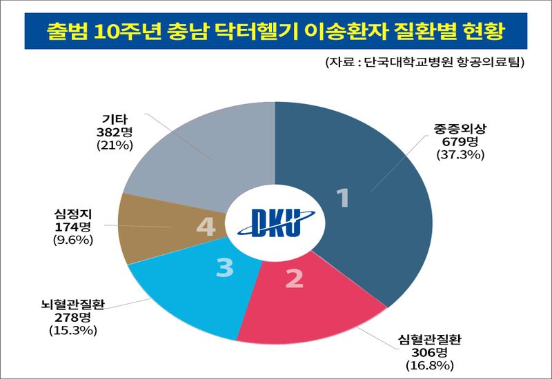 단국대병원 항공의료팀이 충남 닥터헬기 이송환자 1819명을 분석한 결과, 질환으로 인한 환자가 1068명(58.7%), 외상환자가 751명(41.3%)으로 나타났다.