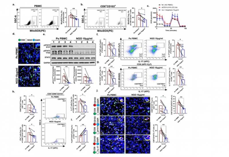 그 결과, 나노그래핀옥사이드가 처리된 면역세포는 활성산소가 감소하고 미토콘드리아 기능이 정상 수준으로 회복됐다. 또 인산화 STAT3가 줄어 IL-17 분비 세포 수 역시 유의미하게 감소했다.