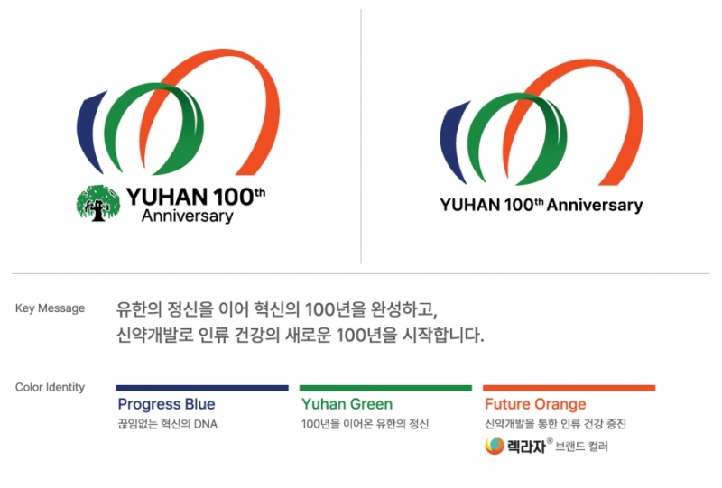 엠블럼은 유한의 정신을 계승해 혁신 100년을 완성하고, 신약 개발을 통해 인류 건강의 새로운 100년을 열겠다는 기업 방향성을 세 가지 핵심 색상으로 표현했다.