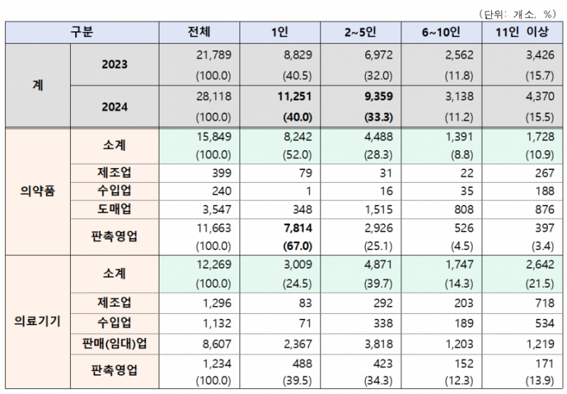 실태조사 결과에 따르면 전체 제출 업체의 73.3%가 5인 이하의 소규모 사업장이며, 무엇보다 의약품 판촉영업자의 67.0%가 1인 사업자인 것으로 드러났다.