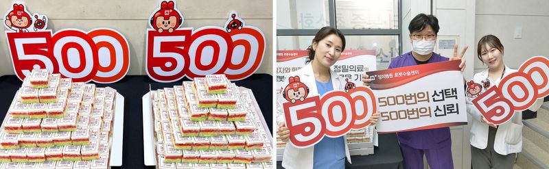 이날 의료진은 로봇수술 정밀함을 상징하는 의미로 500개로 커팅된 무지개 떡을 병실 환자와 병원 직원들이 함께 나누며 500례 달성 의미를 공유했다.