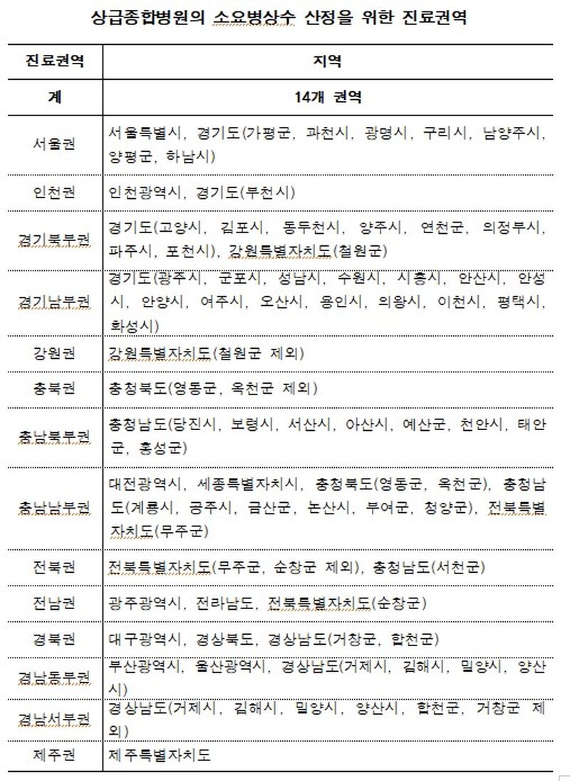 개정안에 따르면 기존 11개 진료권역이 14개로 확대된다. 환자의 의료이용 양상을 고려하고, 상급종합병원 분포 적정화 및 지역별 공급 불균형 해소 차원이라는 게 복지부의 설명이다.