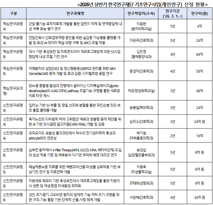중견 연구자로의 도약을 이끄는 핵심연구 분야에서는 의과대학과 간호대학 교원이 나란히 유형 A·B 및 도약형 과제에 선정되며 균형 있는 연구 경쟁력과 질적 성장 기반을 확고히 했다.