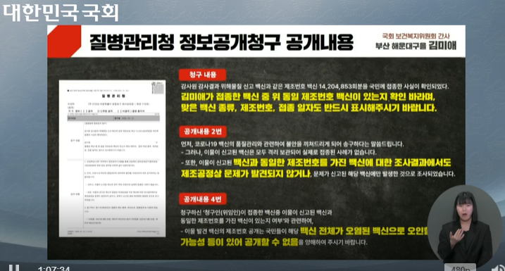 다시 김미애 의원은 “그건 국가 할 일이다”고 선을 그으면서 질병청에 관련 정보공개 청구를 했지만 회신받지 못한 사실을 밝혔다.