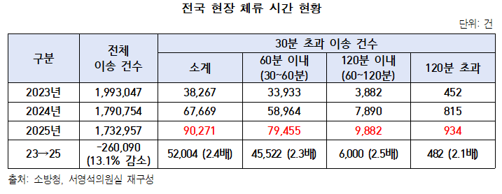 구체적으로 보면 현장 체류 60분 이상 이송건수는 2023년 3만3933건에서 2025년 7만9455건으로 2.3배 증가했다.