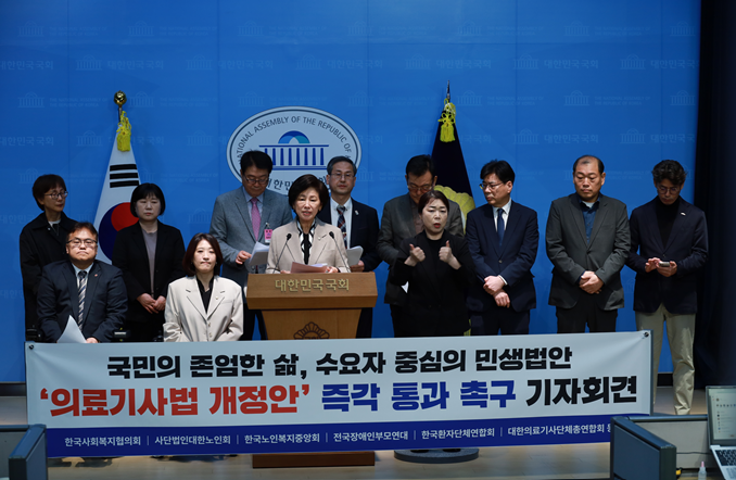 더불어민주당 남인순 의원과 국민의힘 최보윤 의원은 오늘(21일) 국회 소통관에서 노인·장애인·환자·사회복지·의료기사 단체 대표들과 기자회견을 갖고 의료기사법 개정안의 국회 통과를 촉구했다.