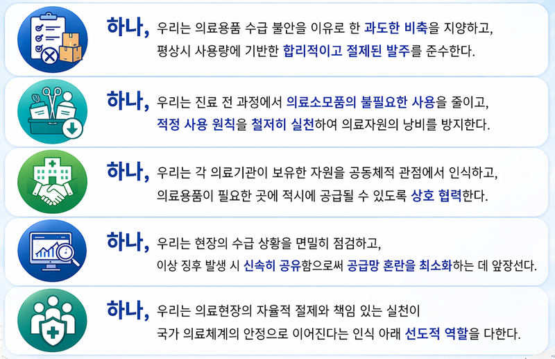 선언문에는 △과도한 비축 지양 △의료소모품 적정 사용 △의료기관 간 협력 강화 △수급 이상 징후의 신속한 공유 △자율적 책임 실천 등 5대 원칙이 담겼다.