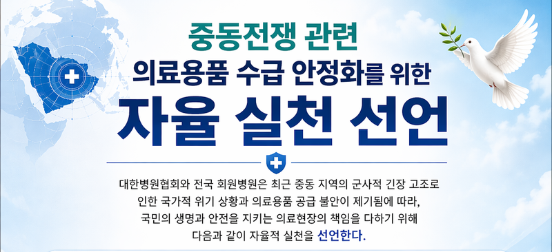 대한병원협회(회장 이성규)는 23일 상임고문·상임이사 및 시도병원회장 합동회의에서 ‘중동전쟁 관련 의료용품 수급 안정화를 위한 자율 실천 선언’을 채택했다.