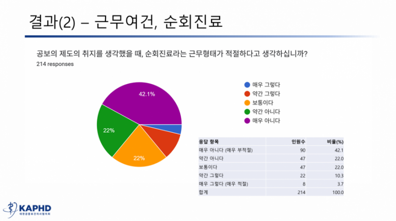 설문에 따르면 응답자 64.1%는 순회진료가 공보의 제도 취지에 부합하지 않아 부적절하다고 답했다. 그 이유로는 ‘주변에 민간의료기관으로 대체 가능한 근무지가 다수 있음’(64.9%)이 가장 많은 응답을 차지했다.