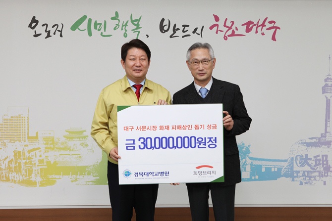 경북대병원은 대구광역시 서문시장 피해상인 돕기를 위한 3000만원 성금 전달에 동참했다. 조병채 원장은 지난 12월 20일 대구시청을 방문해 대구 서문시장 화재 피해 복구 성금 3000만원을 전달했다. 이번 성금은 병원 전직원들이 화재로 생활 터전을 잃은 시장 상인들의 아픔을 함께 하기 위해 정성을 다해 모았다.