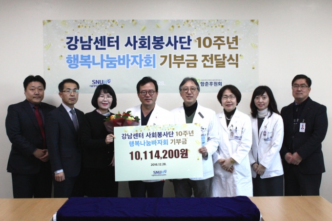 서울대병원 강남센터 사회봉사단 ‘오아시스’는 구랍 28일 창단 10주년 기념 행복 나눔 바자회 수익금 1000만원을 서울대병원 함춘후원회에 전달했다. 강남센터 임직원 200여명은 원내외에서 기부된 물품 판매, 경매 및 경품 추천 등을 통해 기부금을 조성했다.