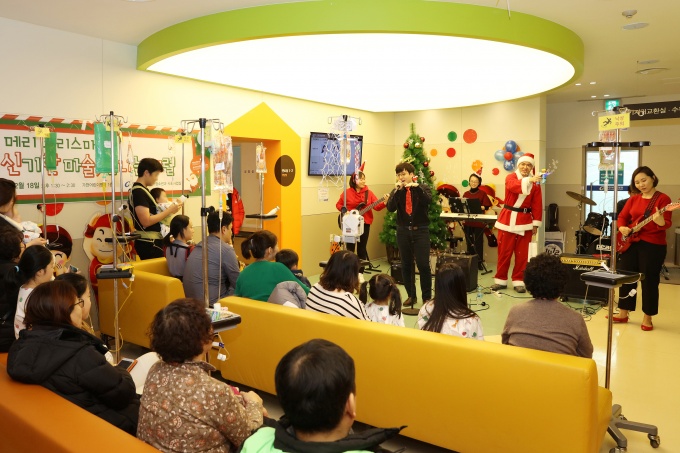 가천대 길병원(병원장 이근)은 18일 가천어린이병원 로비 및 병동에서 어린이를 위한 크리스마스 이벤트를 개최했다고 밝혔다. 소아청소년과 의료진으로 구성된 밴드 공연단은 로비에 무대를 마련하고 정성껏 준비한 크리스마스 캐럴을 선보였다. 입원 생활에 지친 환아들과 보호자, 외래 진료를 받은 환자와 가족들은 경쾌한 리듬의 공연을 감상하며 즐거운 시간을 보냈다. 의료진 공연에 앞서 가천대 길병원 자원봉사자들은 입원 환아들을 대상으로 페이스 페이팅 이벤트를 열어 환아들의 무료한 병동 생활에 작은 기쁨을 선사하기도 했다.