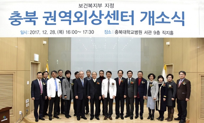 충북대학교병원(원장 조명찬)은 12월 28일 서관 9층 직지홀에서 보건복지부 지정 '충북 권역외상센터 개소식'을 가졌다고 밝혔다. 권역외상센터에는 교통사고, 추락 등에 의한 다발성 골절, 과다출혈 등 중증외상환자가 신속하고 최적의 치료를 받을 수 있도록 외상전담 전문의들이 365일 24시간 대기할 예정이다. 또한 외상환자 전용 수술실, 중환자실 등 시설과 장비, 전담인력을 갖춘 외상전용 전문치료를 제공한다.