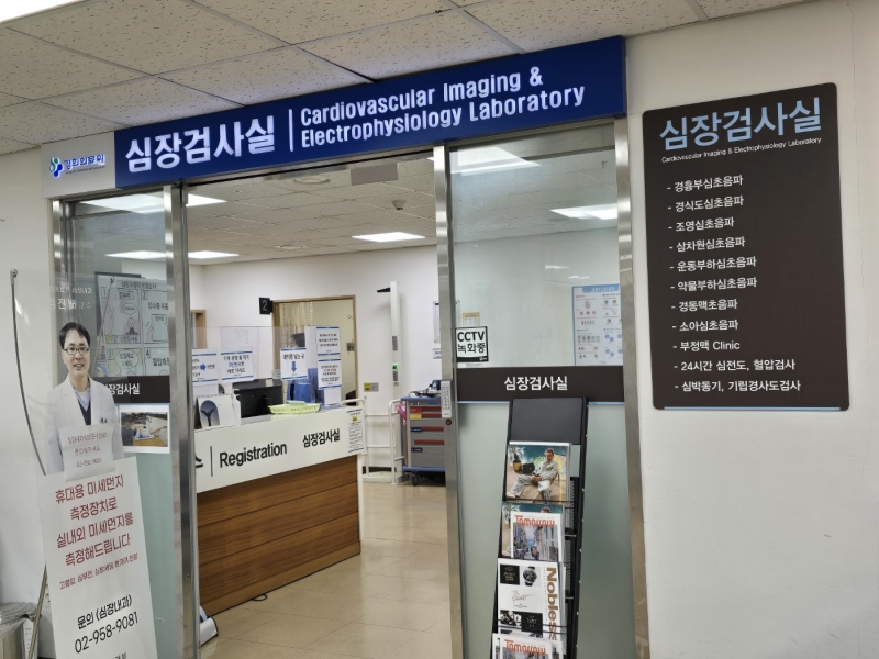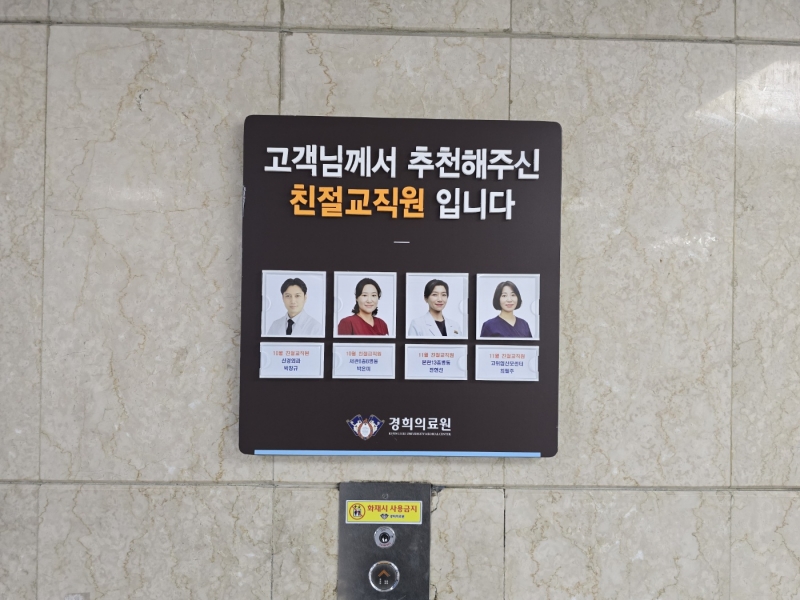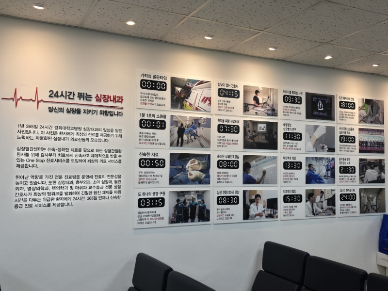환자의 심리적 안정을 위해 곳곳에 마련된 그림 전시도 눈길을 끌었다. 각 층 게시판에는 임상 모집 공고와 진료협력 시범사업 포스터가 부착되어 병원의 활발한 연구 활동을 짐작케 했다. 심장혈관센터 벽면에는 '24시간 신속·정확한 치료'를 약속하는 문구와 구체적인 운영 프로세스가 안내되어 신뢰를 더했고, 각 층마다 게시된 '이달의 친절 교직원' 사진은 환자 중심 병원으로 거듭나려는 경희대병원의 적극적인 노력을 보여주고 있었다.