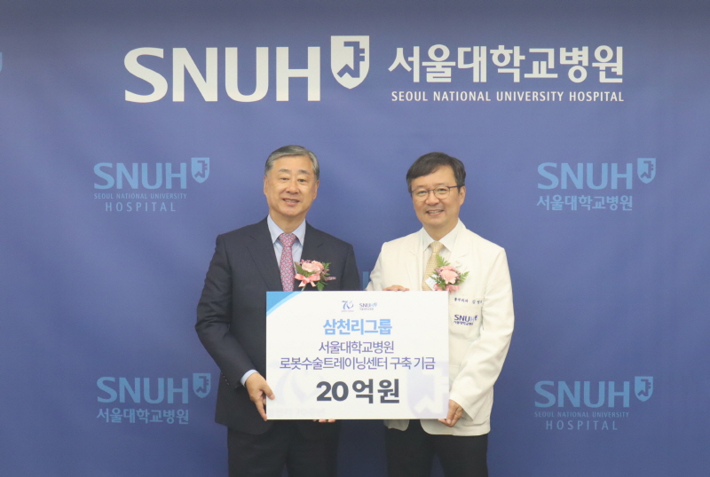 서울대병원(병원장 김영태)은 6월 18일 삼천리그룹으로부터 병원발전기금 20억원을 전달받고 ‘삼천리그룹 로봇수술트레이닝센터’ 현판식을 개최했다. 이번 기부는 삼천리그룹이 창립 70주년을 맞아 추진한 것으로 서울대병원은 이 기부금을 활용해 다양한 최첨단 로봇 수술시스템을 갖춰 질환별 맞춤형 치료역량을 강화하고 보다 효율적인 수술과 교육환경을 조성했다. 향후 서울대병원은 이 센터를 중심으로 국내뿐만 아니라 해외 수련의 대상 시뮬레이션 기반 프로그램을 제공할 계획이다.