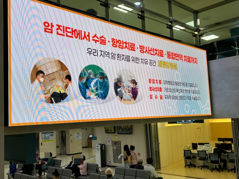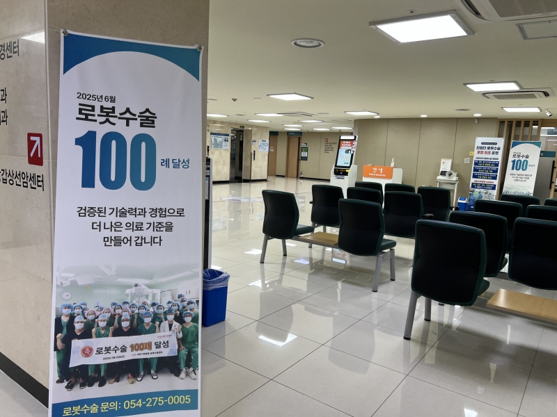 10월 15일 오전 10시, 포항세명기독병원은 평일 오전임에도 1층 로비가 진료 대기 환자들로 붐비고 있다. 병원 내부 곳곳에는 ‘로봇수술 100례 달성’과 ‘포항 최초 다빈치 로봇수술 본격 운영’이라는 현수막이 걸려 있으며, 대형 전광판에서는 암 진단부터 수술·항암·방사선·면역치료까지 원내에서 통합적으로 제공한다는 세명암병원의 홍보 영상이 연속 재생되고 있다. 특히 2023년 미국수부외과학회(ASSH)에서 Clinical Pearl Award를 수상한 연구 성과를 전시하며 학문적 위상과 연구 역량을 함께 드러내고 있다.
