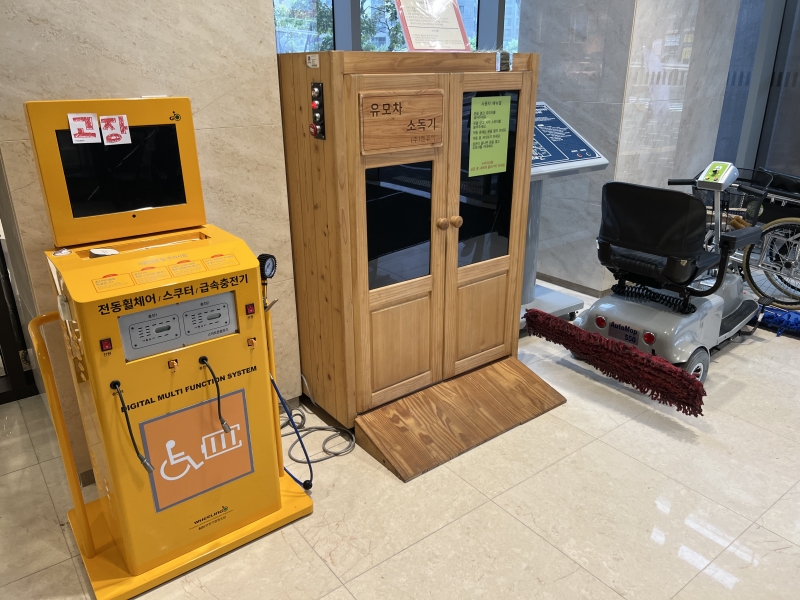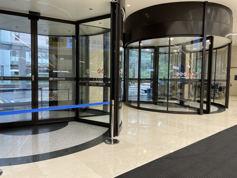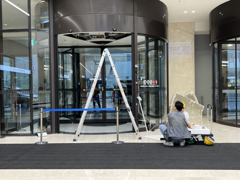 입구 쪽에서는 자동 회전문 유지보수 작업이 한창이다. 안전모를 착용한 외부 기술진과 병원 관계자들이 함께 회전문 작동 상태를 점검하고 있으며 출입 통제가 부분적으로 이뤄지고 있다. 원내 곳곳에는 모바일 앱 리뉴얼 안내와 기부 참여 홍보존, GTX-A 연신내역 개통 홍보 패널 등 다양한 병원 정보가 걸려있다.