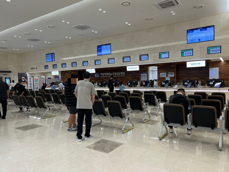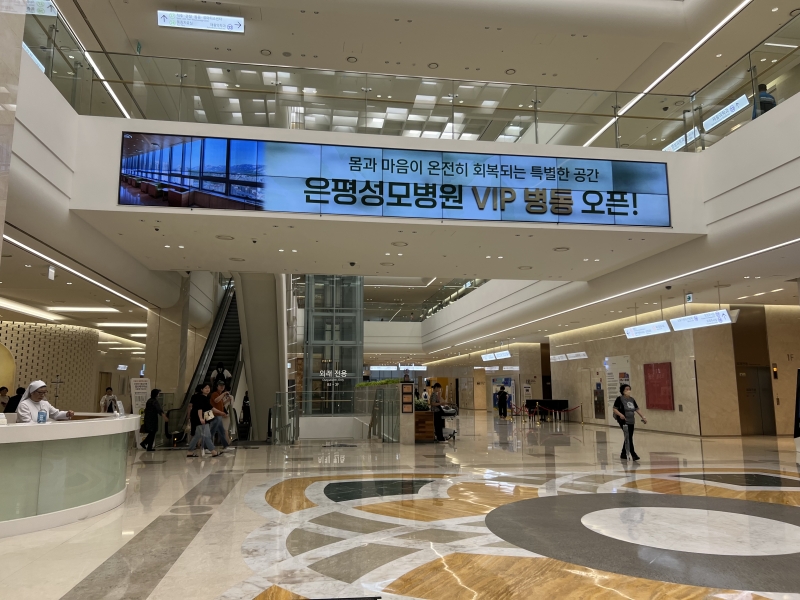비가 세차게 내리는 9월 17일 오전 10시. 가톨릭대학교 은평성모병원은 차분한 분위기 속에 진료를 이어가고 있다. 병원 로비는 넓고 쾌적한 구조로 환자와 보호자, 내원객들의 동선이 원활하게 유지되고 있고 중앙 천장에는 설치된 대형 전광판에는 'VIP 병동 오픈'이라는 안내 문구가 송출되며 고급 병동 개방 소식을 알리고 있다.