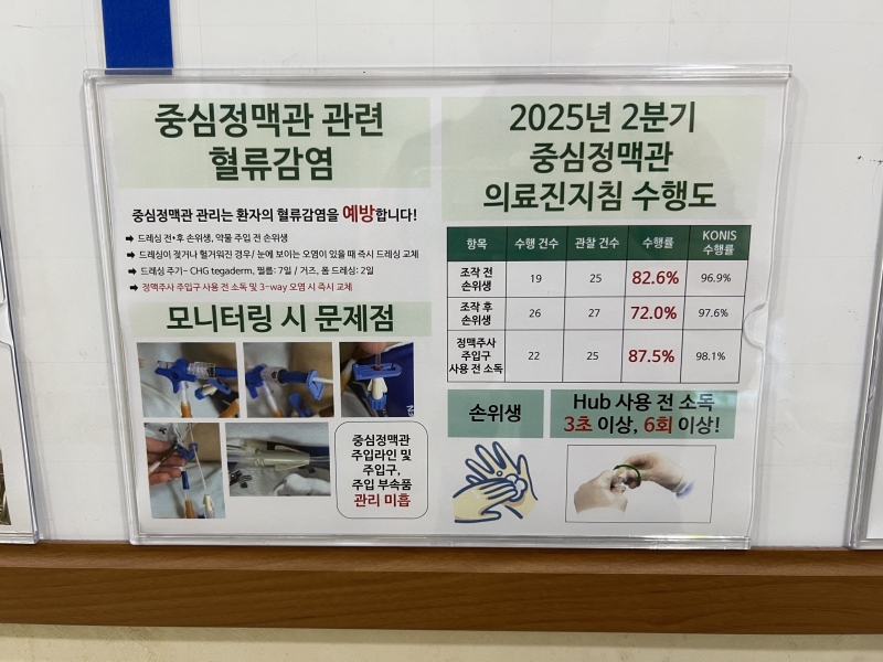 병원 내부 게시판에는 직원 재해 발생률 현황이 그래프로 게시돼 있다. 2025년 2분기 기준 재해율은 0.3%로 집계되며 사고 유형은 넘어짐, 찔림, 부딪힘 등이다. 주요 원인은 작업 방법 부족과 서두름, 개인 부주의로 나타나고 있으며, 간호부에서 가장 많은 사고가 발생했다. 감염관리 측면에서는 중심정맥관 관련 혈류감염 예방 지침 수행도가 공유되고 있다. 손위생과 소독 등 필수 항목 수행률은 평균 70~80%대를 보이고 있으며 문제점으로는 주입라인 관리 미흡과 소독 누락이 지적됐다.