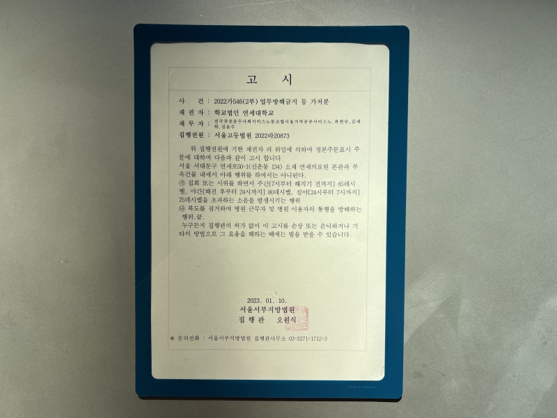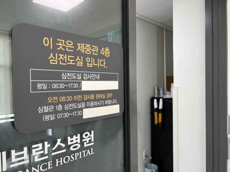 제중관 4층에 마련된 심전도실은 22일(토) 진료 종료로 인해 일부 문구가 가려져 있다. 또 한편에는 맥라렌 회의실 공사로 일부 통행이 제한돼 있고, 일부 진료과 원무수납 창구는 운영을 종료했다. 병원 내부 기둥에는 법원의 ‘임무해금지 가처분’ 고시문, 그리고 곳곳에 보이는 낡은 시설은 시간의 흔적을 고스란히 드러냈다.