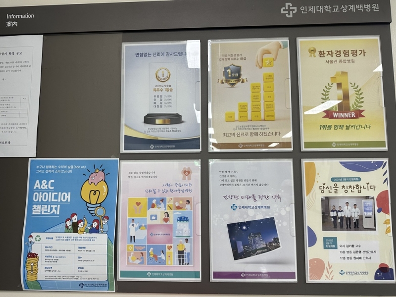 복도 한켠에 위치한 안내게시판에는 환자경험평가 최우수병원 선정 소식과 함께 병원 운영 아이디어 공모전 등 내부 공지 사항이 게시돼 있었다. 특히 눈길을 끈 것은 'A&C 아이디어 챌린지' 모집 공고였다. 병원 측은 수익 증대와 비용 절감을 위해 교직원을 대상으로 창의적인 개선 아이디어를 공모 중이며 총 300만원의 상금이 지급된다.