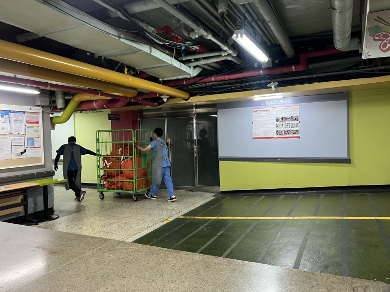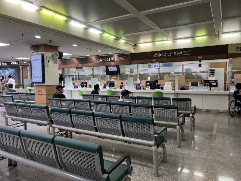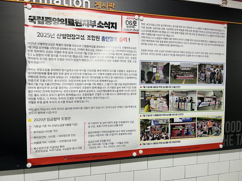 특히 최근 의료원 변화 중 하나로 본관 1층 로비 곳곳에 환자 소통 활성화를 위해 마련된 디지털 사이니지가 눈길을 끈다. 내부 게시판에는 의사 식사지시율, 임단협 타결 내용 등이 안내돼 있다. ‘기본급 3% 인상’과 ‘여름휴가비 상향’ 등 노동 환경 개선 성과가 소개되고, 여름 퀴즈 당첨자 명단이 붙어 있어 병원 일상을 보여주고 있다. ‘국가중심병원’을 표방한 국립중앙의료원의 정체성과 실험이 동시다발적으로 진행되고 있다. 낡은 공중전화기처럼 과거의 흔적은 여전하지만 국립중앙의료원은 내부부터 조용히 탈바꿈 중이다.