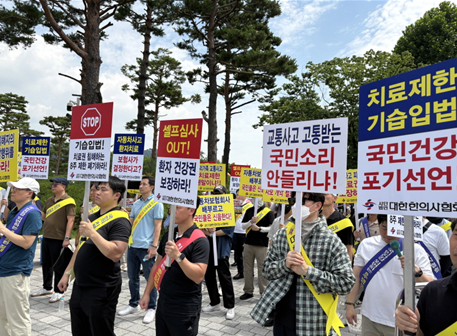 대한한의사협회(회장 윤성찬)는 보험이용자협회, 소비자주권시민회의와 24일 서울 용산 대통령실 앞에서 한의사 회원 등 300여 명이 모인 가운데 ‘국토부의 자동차손해배상 보장법(자배법) 시행령·시행규칙 개악 철폐를 위한 경기·인천권 궐기대회’를 개최했다. 이날 서만선 한의협 자배법 하위법령 개악 철폐 TF위원장과 김미숙 보험이용자협회 대표, 곽도성 소비자주권시민회의 팀장은 대통령실에 자동차손해배상 보장법 시행령 및 시행규칙 개정안의 철회를 촉구하는 요구서를 전달했다.