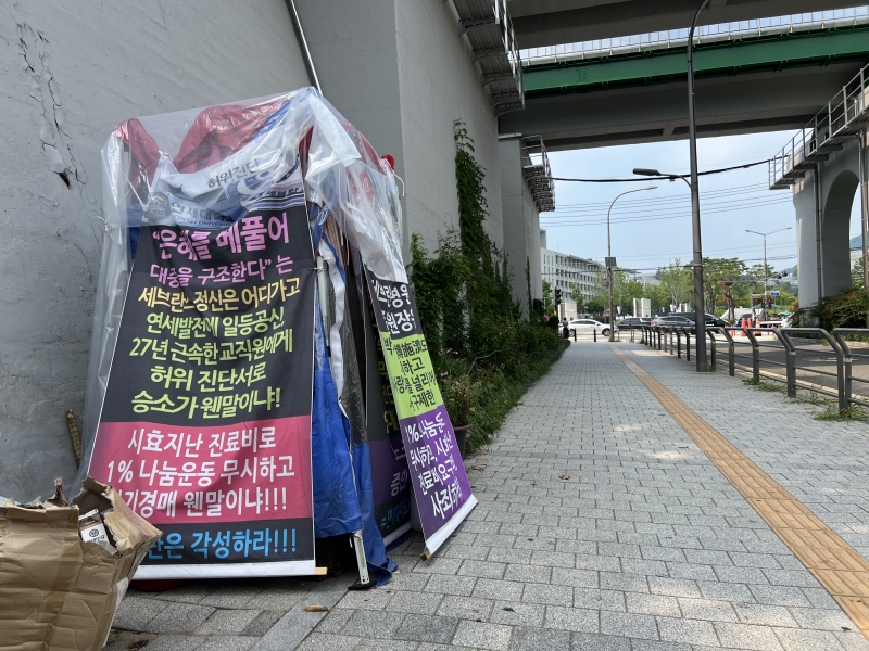 숨이 턱 막히는 폭염이 이어지는 7월 29일 오후 2시. 세브란스병원이 상업시설 재편 작업으로 분주하다. 병원 곳곳에는 폐점 안내문과 가림막이 설치돼 있고, 익숙한 매장들이 이미 문을 닫았거나 영업 종료를 앞두고 있다. 변화가 진행되는 공간 사이로 환자와 보호자들이 아쉬움 섞인 발걸음을 옮긴다. 병원 외부에는 다양한 풍경이 겹친다. 파손된 보도블럭이 수리를 기다리고 있고, 인근에는 개인 시위자가 천막을 치고 자리를 지키고 있다. 뜨거운 열기를 내뿜는 버스가 병원 앞을 지나가고 그늘 없는 공간을 피해 환자와 보호자들이 서둘러 병원 내부로 들어간다. 중앙 아트리움 한쪽에는 ‘세브란스 소원트리’가 마련돼 있다. 가지마다 환자와 보호자들이 꾹꾹 눌러 쓴 희망의 메시지가 빼곡히 적혀있다.