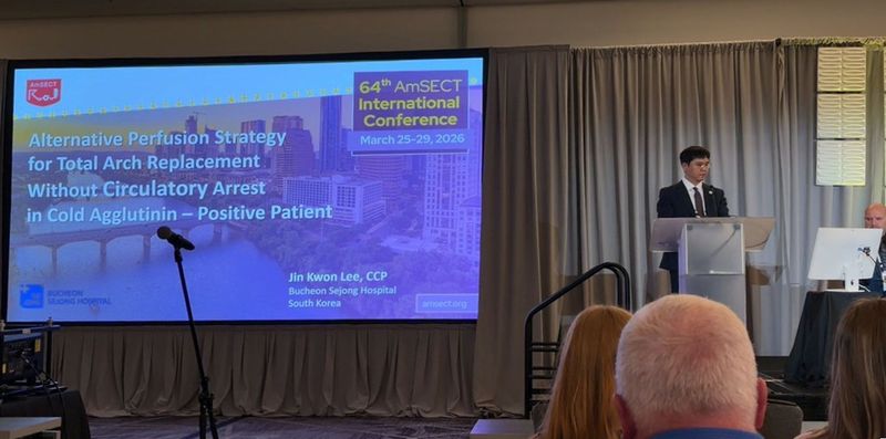 부천세종병원(병원장 이명묵)이 시행하는 ‘저체온 유도 없는 특수 순환 방식의 심장 수술법’이 국내와 아시아에 이어 미국에까지 소개되며 주목받고 있다. 부천세종병원 심폐기팀 이진권 팀장은 최근 미국 텍사스에서 열린 ‘제64회 미국체외순환기술협회(AmSECT) 국제 컨퍼런스’에 초청, ‘냉 응집 항체를 가진 환자 대상 대동맥궁 치환술을 시행하기 위한 대체 관류 전략’을 주제로 강연을 펼쳤다. 이진권 팀장은 다각도의 시뮬레이션과 논의를 거쳐 새로운 순환 전략을 수립했고, 지난 2023년 1월 마침내 냉 응집 항체를 가진 대동맥궁 파열 환자 A씨(78)를 대상으로 저체온 유도 없는 새로운 순환 방식을 적용, 국내 최초로 치환술에 성공했다.
