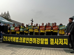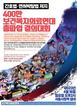 대한의사협회를 비롯해 13개 의료계 단체가 참여하는 보건의료복지연대의 "간호법 및 의료인면허취소법 반대" 외침이 서울시청에서 서울역까지 울려퍼졌다.이들은 간호법 추진을 강행하는 더불어민주당과 양대노총, 대한간호협회에 맞서 연대하며 총파업 불사를 선언했다.13개 보건의료복지연대는 16일 서울 시청 근처에서 2시부터 '보건의료복지연대 총파업 결의대회'를 개최했다.이필수 대한의사협회 회장은 "간호법과 의료인면허박탈법의 본회의 상정 논의 및 시도를 강력히 규탄하고, 불합리한 현실에 대해 국민과 국회, …