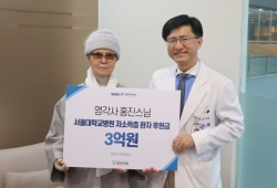 서울대학교병원(병원장 김영태)은 최근 영각사 주지 홍진스님으로부터 저소득층 환자 후원금 3억원을 전달받았다.희귀질환 연구 및 저소득층 환자 지원을 위해 2017년부터 서울대병원에 나눔을 지속해 온 홍진스님은 이번 기부로 누적 후원금 약 4억원을 돌파했다.후원금 3억원은 전액 저소득층 환자 치료비로 사용될 예정이다.