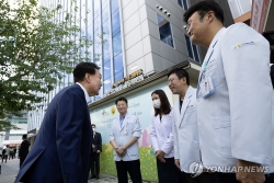 (서울=연합뉴스) 곽민서 기자 = 윤석열 대통령은 추석 연휴 마지막 날인 18일 지역 어린이병원을 방문해 의료진을 격려했다.윤 대통령은 이날 성북구 우리아이들병원에서 의료진과 만나 "연휴에도 아픈 아이들을 위해 애써주셔서 감사합니다", "의료진 덕분에 부모들이 안심할 겁니다"라며 감사 인사를 전했다고 대통령실 정혜전 대변인이 서면 브리핑에서 전했다.윤 대통령은 입원실을 둘러보며 어린이 환자들의 안부를 묻고, 어린이들의 '셀카' 요청에 응하기도 했다.윤 대통령은 이어 정성관 우리아이들의료재단 이사…