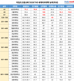 정리 구교윤 기자성균관대학교가영국 대학평가기관 타임즈고등교육(THE)이 발표한 ‘2026 THE 세계의과대학 순위(Medicine World University Rankings 2026)’에서 국내 대학 중 가장 높은 순위를 기록했다.이번 순위는 의과대학 연구 성과뿐 아니라 교육 여건, 산학협력, 국제화 수준을 함께 반영한 평가로 국내 대학들은 상위권과 중위권 간 점수 차이가 뚜렷하게 나타났다.23일