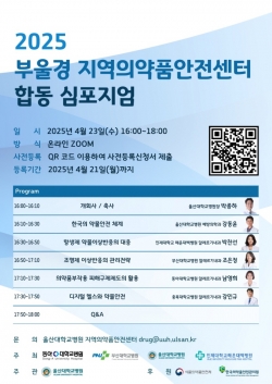 울산대학교병원은 오는 23일 '2025 부울경 지역의약품안전센터 합동 심포지엄'을 온라인으로 개최한다.이번 심포지엄은 부산‧울산‧경남 지역의 4개 지역의약품안전센터인 울산대병원, 동아대병원, 부산대병원, 인제대해운대백병원이 공동주최한다.참가비는 무료이며, 의사‧약사‧간호사 등 보건의료인은 물론 일반 시민 누구나 참여할 수 있다. 참여를 원하는 경우 오는 21일까지 포스터의 QR코드를 통해 간편하게 사전 신청하면 된다.▲항생제나 조영제 등 다빈도 약물 이상반응 대응 및 관리 전략 ▲의약품 부작용 피해구제제도 활용 방안 ▲안전한 약…