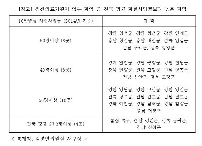 국회 보건복지위원회 김명연 의원이 보건복지부 등록 정신의료기관 현황과 2014년 기준 자살사망률통계를 분석한 결과, 정신의료기관이 없는 지자체 43개 지역 중 30곳의 자살사망률이 전국 평균인 27.3명보다 높은 42.58명이었다.